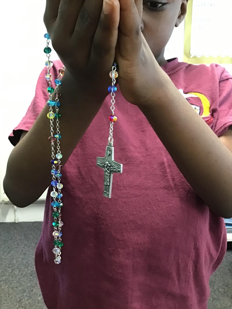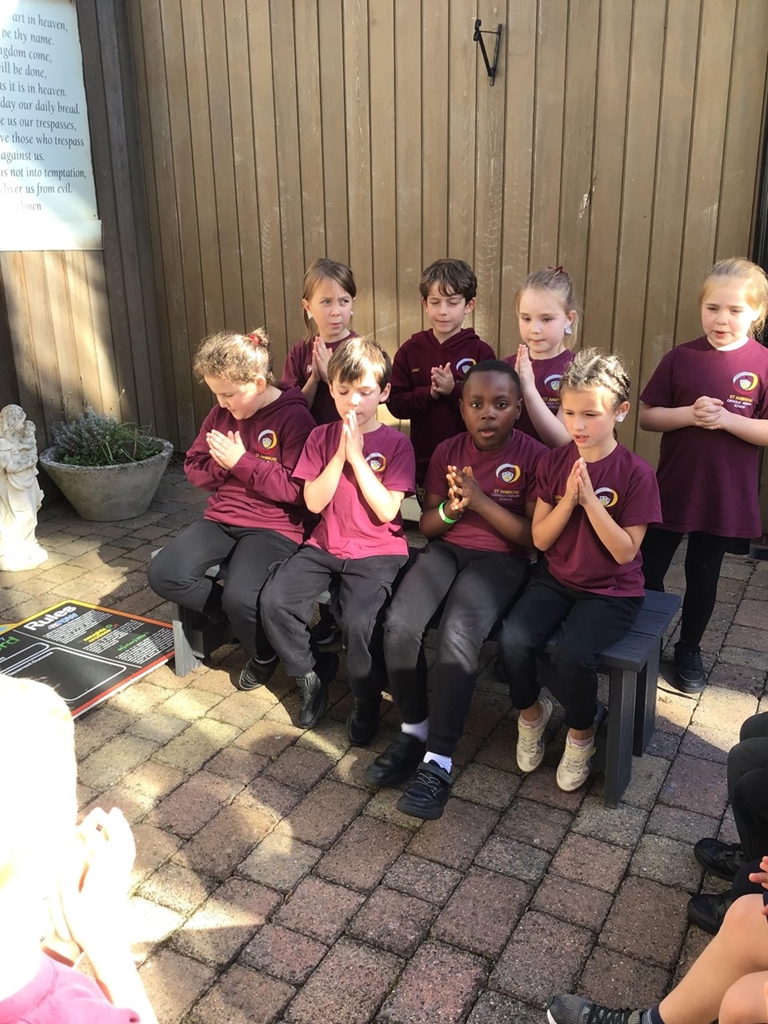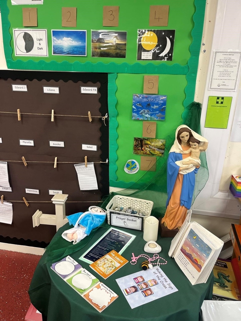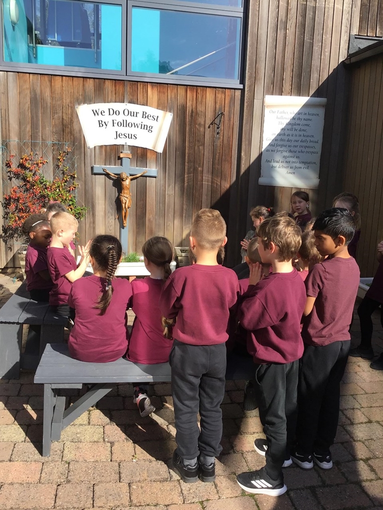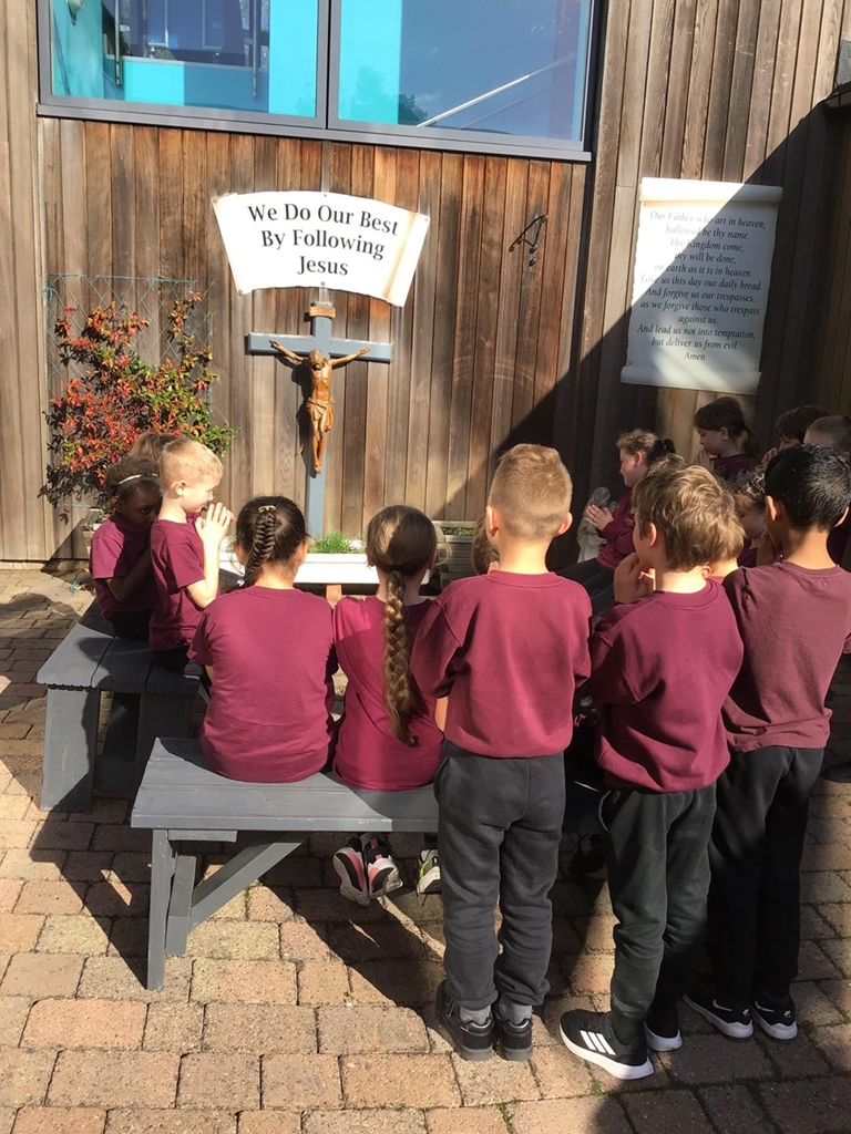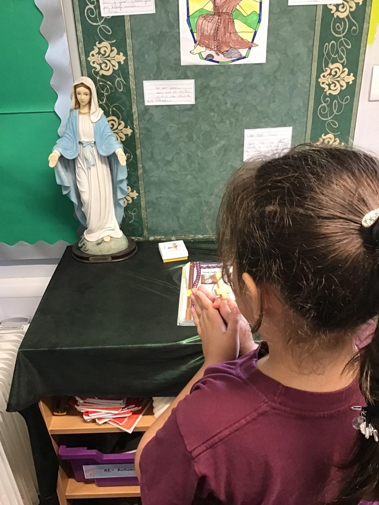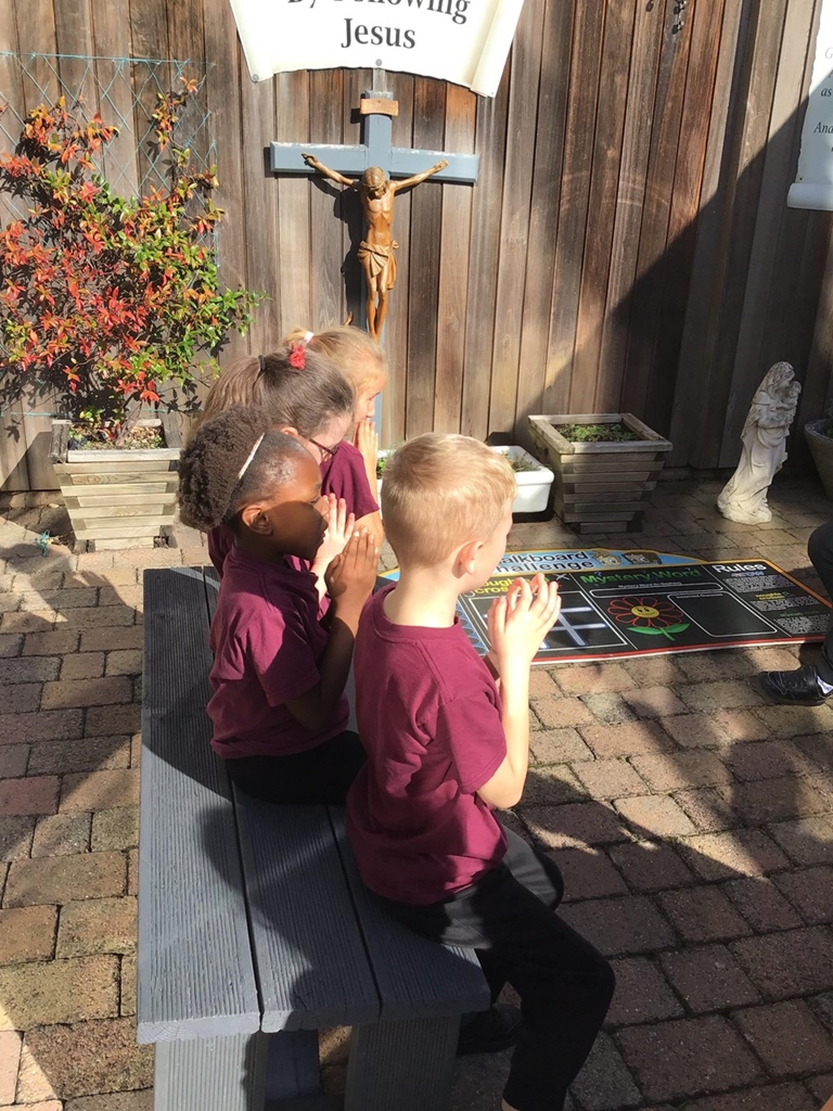 ''We speak to God!'' Preschool child. ''We know the Our Father now!'' Reception child. ''When we pray, we speak to God.'' Y1 child ''God calls me to care for our planet because He created it.'' Y2 child. ''Every day we speak to God and have learnt to listen to what He asks us to do.'' Y3 child. ''Before my First Holy Communion, we learnt different types of prayers, like the silent ones after Communion which is when it's just your special time with God.'' Y4 child. ''One of my favourite times of year is when we gather as a school to pray the Rosary. It is really special.'' Y5 child. ''Taking time each day to pray together is special and it reminds us about what Jesus said.''Y6 child. When two or three gather in His name, He is present among them. Matthew 18:20