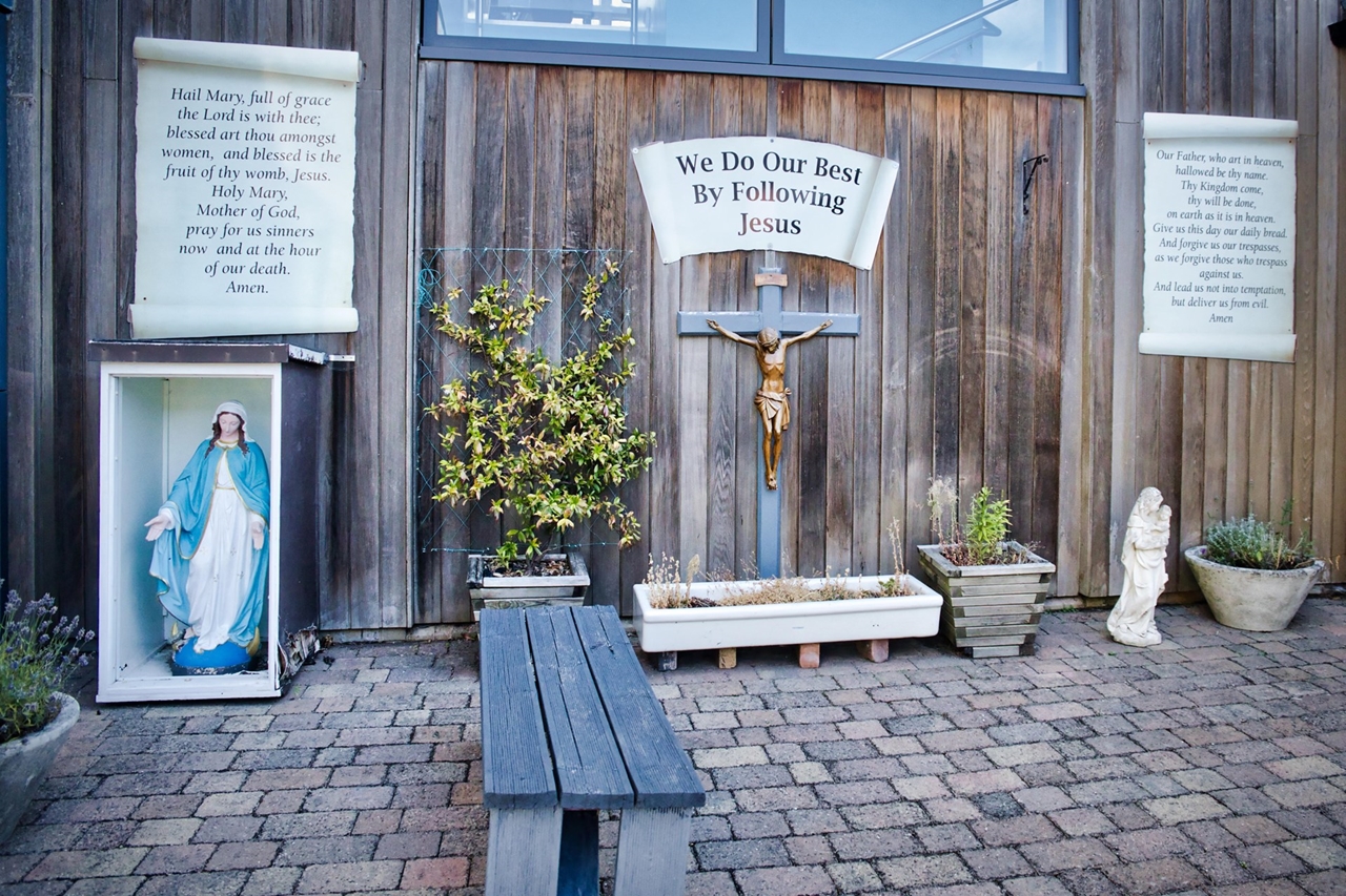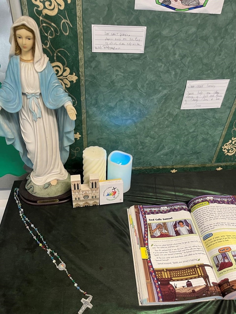 We are so lucky with the layout of our school to have many beautiful spaces for prayer. Every classroom and available space around school has a focal point for prayer which is appropriate to the liturgical season. As you can see, our courtyard is a wonderful space for quiet prayer and group prayer. We are so lucky to have such a beautiful space. We also use this space to grow plants to remind us of how to care for God's creation and live out our CST.
