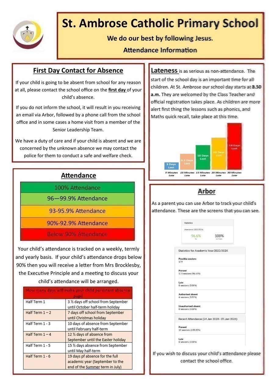 Regular attendance at school means that your child will make the most of their education and improve their chances later on in life. At St Ambrose, good attendance is of high importance and we strive to have at least 96% attendance. Please help us with this target. If you need any support, then school is here to help so that your child can get the very best out of the education we provide.
