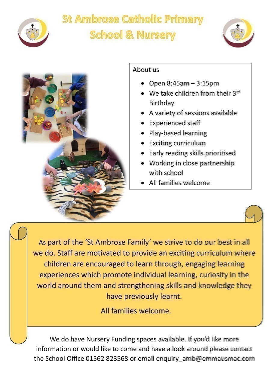 Please see the leaflet regarding our Nursery. If you or anyone you may know has a child of nursery age please can we ask that you pass on the information regarding the St Ambrose Nursery.